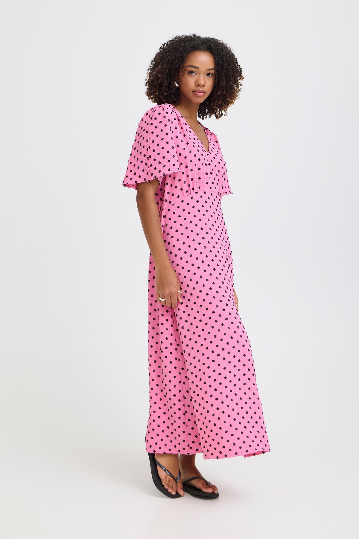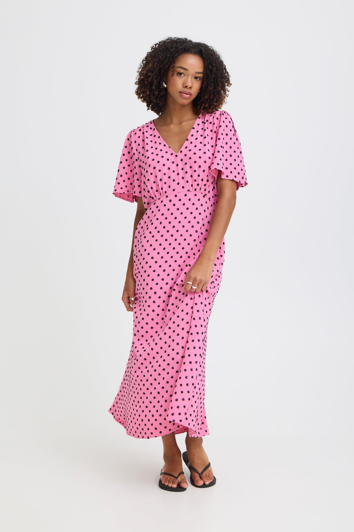 - Fit: Elegant Polka dot midi dress features a flattering V-neckline, softly draped flutter sleeves, and a gently fitted silhouette with a fluid A-line skirt.